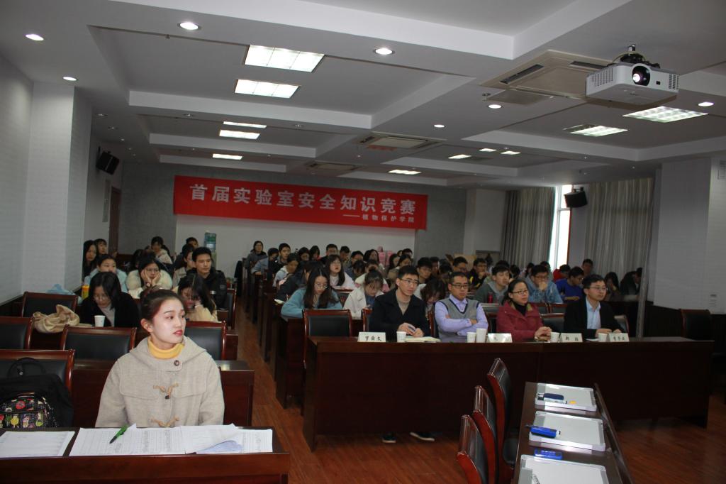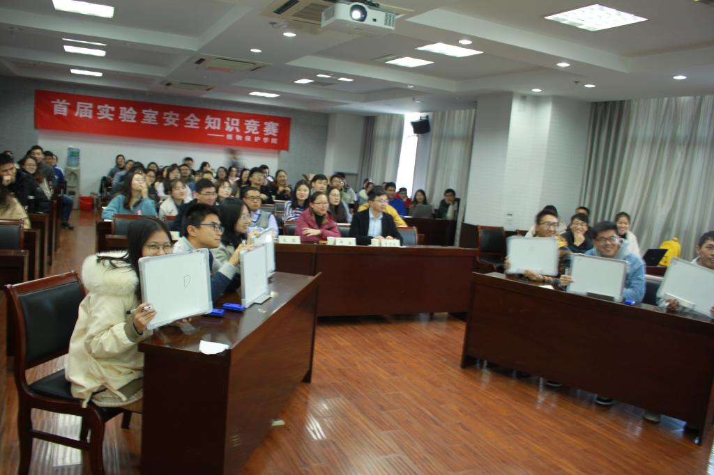 在理科楼C303举办了“首届实验室安全知识竞赛”活动。此次竞赛邀请了学院副院长王兴亮、公共实验平台老师郑颖、科研秘书朱凯、研究生辅导员李子成和安全秘书罗舜文五位老师出席。参加活动的研究生涵盖了全院所有课题组,共有24支代表队参与比赛。