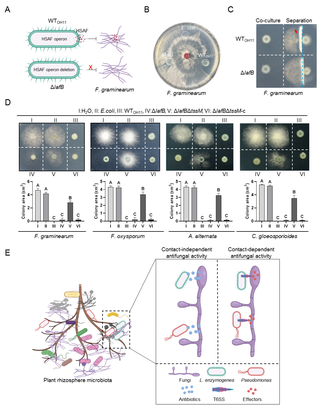 为了验证细菌T6SS介导的接触抑制真菌活性在自然界中的普遍性,课题组筛选了一系列生防溶杆菌与假单胞菌,发现荧光假单胞菌2P24能够独立于抗菌代谢产物2,4-DAPG,通过细胞接触抑制真菌生长,并且其T6SS参与了这一过程。在此基础上,课题组建立了“病菌富集-接触抑菌”的筛选策略,从土壤中筛选出一系列具有接触抑制真菌活性的土壤细菌,并鉴定出一株黄褐假单胞菌FoE9,其T6SS同样参与了接触抑制真菌的活性。这些结果表明,T6SS介导的细菌接触抑制真菌的互作模式在自然界中普遍存在。