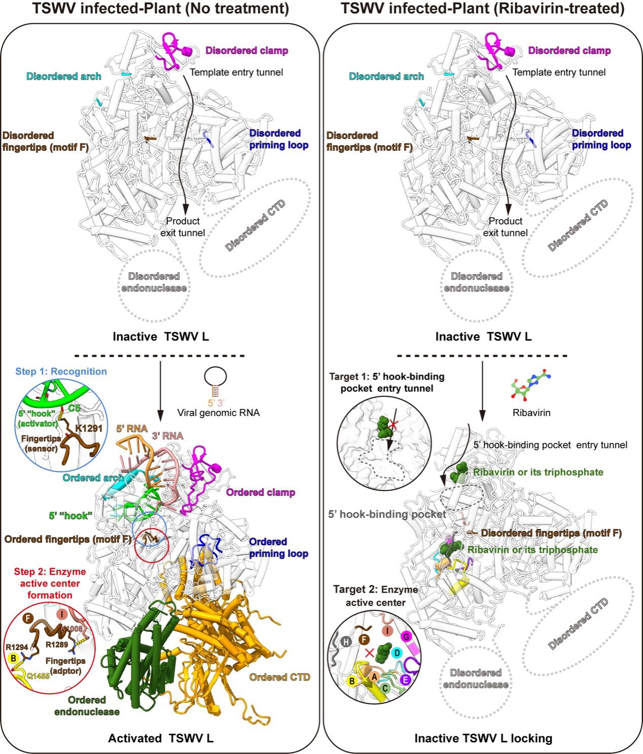 研究发现TSWV RNA复制酶催化中心保守基序F的柔性环在未结合病毒基因组RNA时处于高度无序状态,当加入病毒基因组RNA保守序列后,保守基序F可发挥“传感器”作用感知病毒基因组RNA末端的保守順式作用元件,并稳定柔性环;结构稳定后的保守基序F与保守基序I等发生相互作用,进一步作为“适配器”促进完整催化中心的形成,使复制酶处于激活状态。“我们破解了病毒自我激活的分子开关。”共同第一作者曹磊副研究员指出,病毒基因组5’末端10个碱基长度的RNA序列形成的“钩”状结构是触发复制酶激活的关键。研究还发现核苷类药物利巴韦林及其代谢物利巴韦林三磷酸盐能通过双靶点抑制机制阻断这一过程,完全抑制TSWV在植物中的复制侵染;结构与生化数据表明利巴韦林及其三磷酸盐均能特异性靶向TSWV RNA复制酶上RNA“钩”状结构结合空腔的进入通道和酶活催化中心。