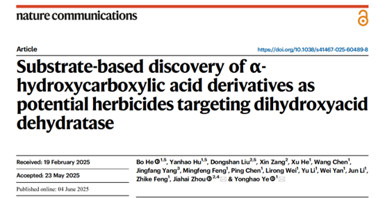 叶永浩教授课题组联合中科院上海有机所/南京师范大学周佳海教授课题组,在Nature Communications期刊上在线发表了题为“Substrate-based discovery of α-hydroxycarboxylic acid derivatives as potential herbicides targeting dihydroxyacid dehydratase”的研究论文。该研究创新性地以植物支链氨基酸(BCAAs)合成途径中的关键酶二羟酸脱水酶(DHAD)为靶标,成功设计并合成具有α-羟基羧酸结构特征的新型除草剂先导化合物,为开发作用机制独特、环境友好的新一代除草剂奠定了重要的分子设计基础。