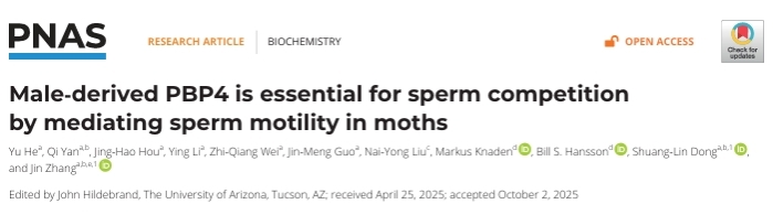 董双林和张进教授团队在美国科学院院报(PNAS)上发表了题为“Male derived PBP4 is essential for sperm competition by mediating sperm motility in moths”的研究论文。该研究发现甜菜夜蛾信息素结合蛋白PBP4通过保守的 PBP-OR(信息素结合蛋白-气味受体)途径,参与精子在雌虫体内从精包到受精囊的转移进而在精子竞争中起重要作用。