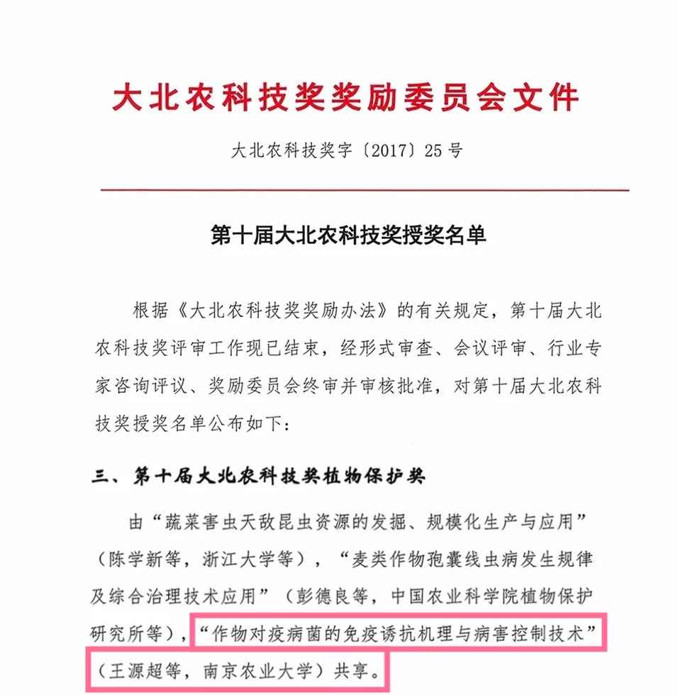 王源超教授主持完成的“作物对疫病菌的免疫诱抗机理与病害控制技术”项目荣获第十届大北农科技奖植物保护奖。