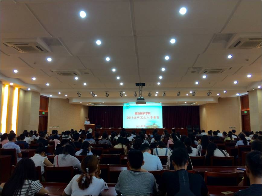 研究生新生入学教育大会在金陵研究院三楼举行。会议由院党委副书记黄绍华主持。党委书记吴益东、院长王源超、副院长叶永浩出席本次会议。出席会议的还有研究生辅导员吴智丹及教学秘书岳丽娜。植保院全体研一新生参加此次会议。