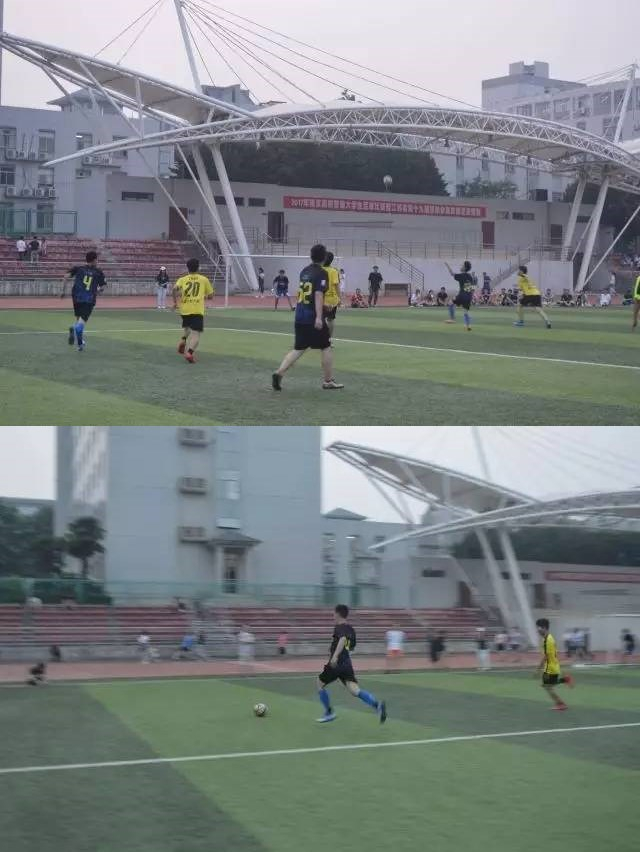由于天气并不是很热,队员们斗志昂扬。随着一声哨声响起,开始了上半场激烈的角逐。一开始,植保院队员就一直压在食品院后场,一次次完美的传球,让对手有些慌乱。趁此机会,队员们为刘毅然创造了一个射门机会,取得一分。上半场结束时比分1:0,植保院领先。下半场,食品院也奋力争分,比赛进行一半时,食品院的一次射门中打中横梁,垂直落地,在争议声中裁判判定食品院进球。下半场结束时比分1:1,最终双方战平。
