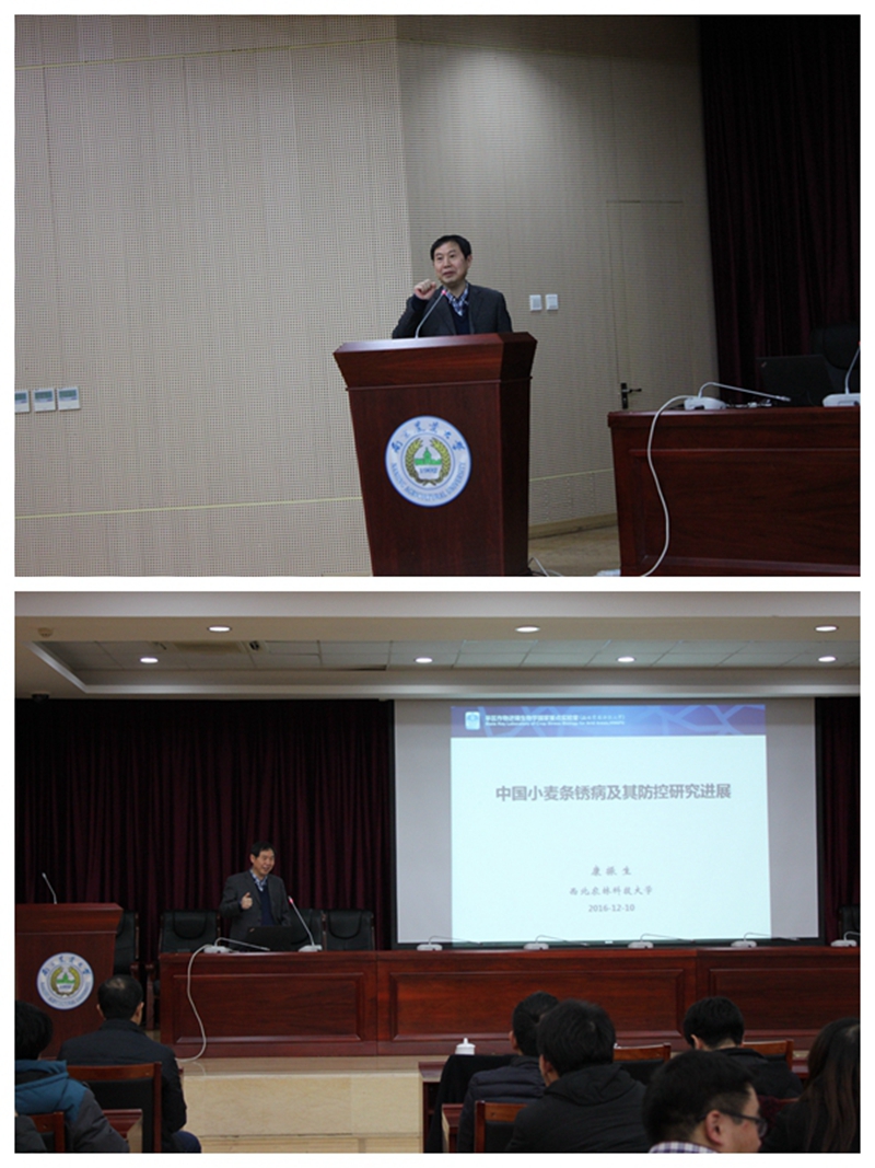 康振生教授是国家杰出青年基金获得者,兼任中国植物病理学会副理事长、国务院学位委员会学科评议组成员等职位。他围绕“中国小麦条锈病及其防控研究进展”进行专题报告,从中国小麦条锈病的综合防控、小麦—条锈菌互作的细胞学机理、小麦—条锈菌互作的分子机理、条锈菌致病分子基础、条锈病菌的有性生殖与毒性变异五方面展开细致论述,引发在场师生思考。