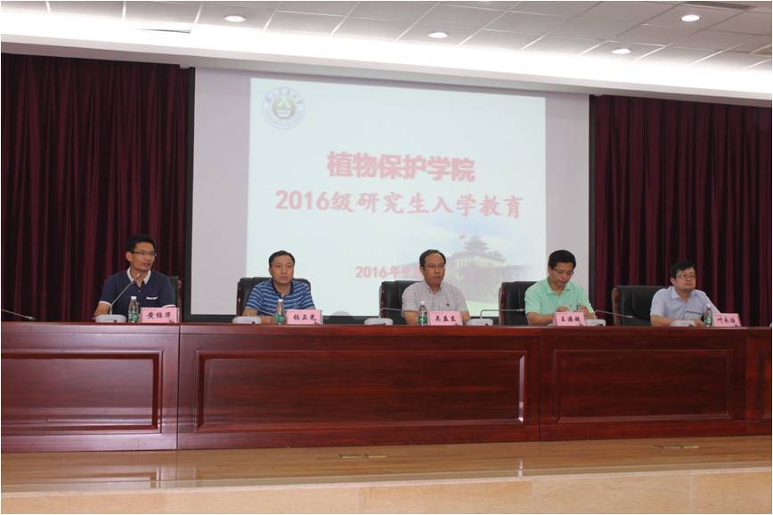 在金陵研究院三楼报告厅召开2016级研究生新生入学教育大会。出席本次会议的有植保院党委书记吴益东、院长王源超、党委副书记黄绍华、副院长张正光、副院长叶永浩、教学秘书岳丽娜和辅导员吴智丹,会议由黄书记主持。