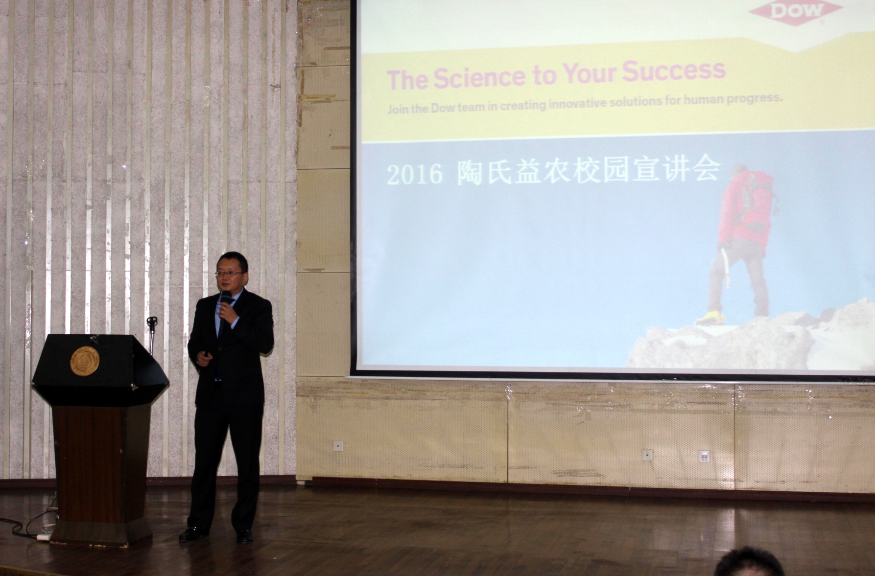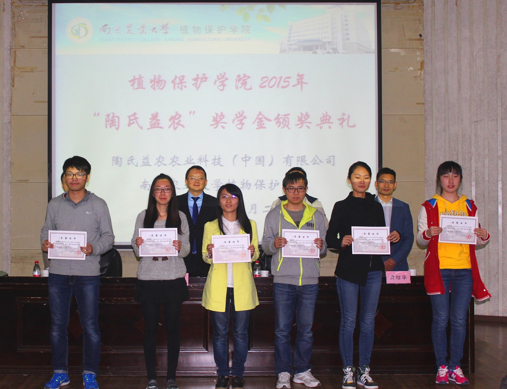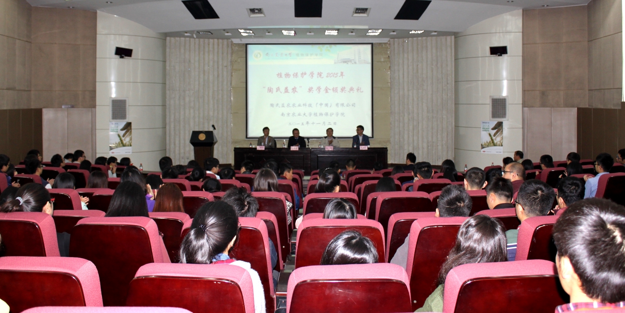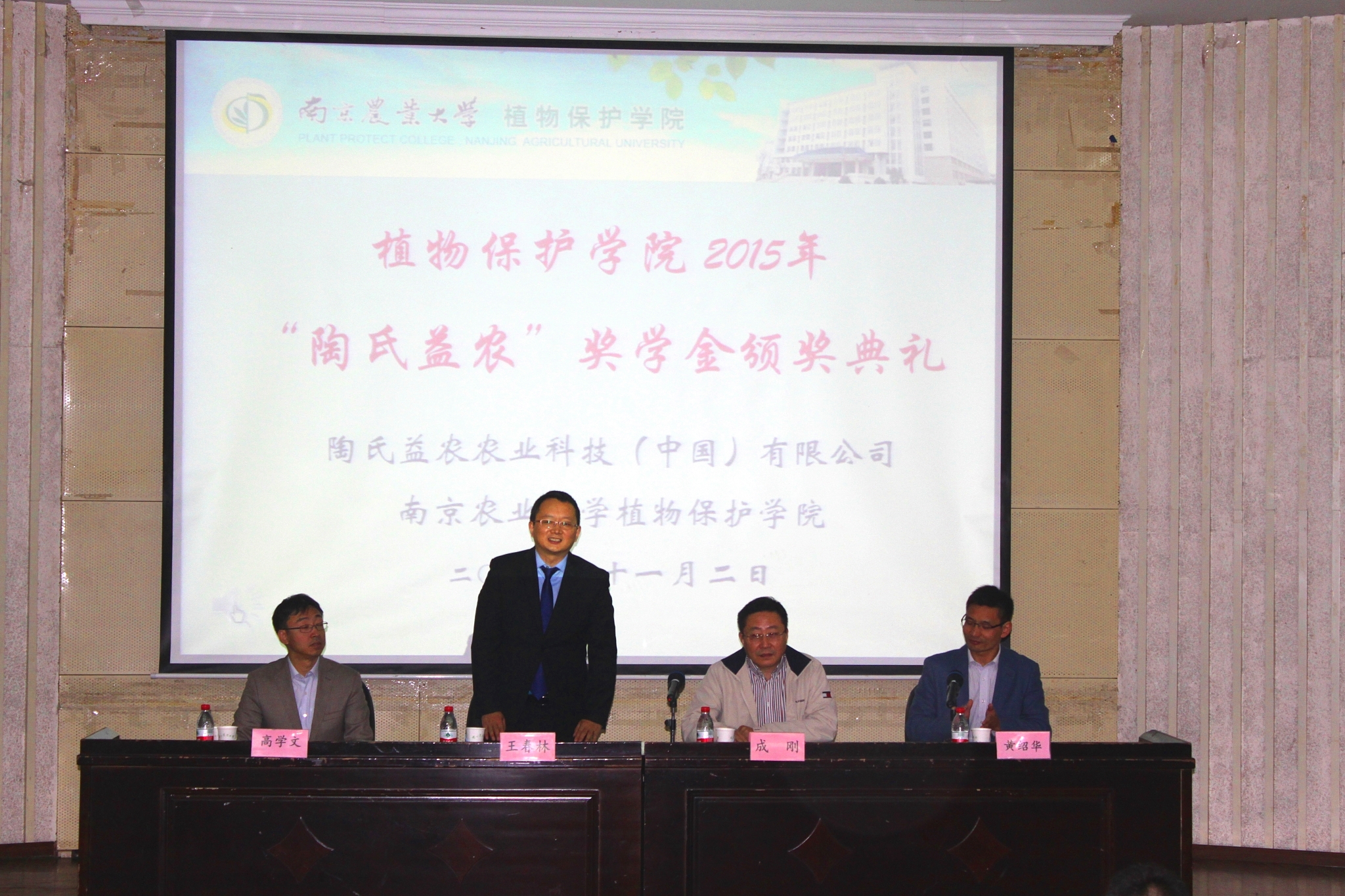 在图书馆报告厅举行陶氏益农奖学金颁奖典礼。陶氏益农大中华区技术传承总监王春林,陶氏益农江苏省销售经理成刚,植保院副院长高学文以及陶氏益农其他领导出席此次典礼。院党委副书记黄绍华担任主持人,获奖学生及2016届毕业生参与仪式。