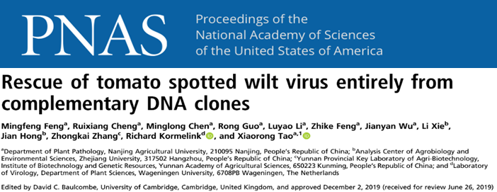 2019年12月26日,国际综合性学术期刊美国科学院院报《Proceedings of the National Academy of Sciences of the United States of America》(五年影响因子10.600)在线发表了我校植物病毒学实验室一项最新研究成果,研究论文题为《Rescue of tomato spotted wilt virus entirely from complementary DNAclones》,该研究成功拯救出番茄斑萎病毒,首次建立植物多分体负链RNA病毒的反向遗传学体系。