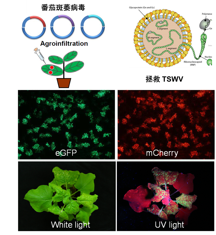 课题组通过艰难的历程首先明确了驱动病毒基因组RNA的合适的启动子,接着实现对将近330kDa 病毒复制酶在植物中成功表达,在此基础上建立了番茄斑萎病毒的微型基因组复制体系,同时建立了病毒微型基因组复制的移动体系。在拯救建立全长病毒基因组时,课题组又碰到过表达病毒复制酶干扰病毒拯救,基因组M RNA无法被拯救,表达病毒抑制子NSs干扰基因组SRNA的拯救等一系列问题,课题组再通过一系列的优化,最终成功实现番茄斑萎病毒全长侵染性cDNA克隆的拯救,拯救的病毒可以携带eGFP报告基因系统侵染植物。番茄斑萎病毒反向遗传学系统的建立提供了对该病毒的侵染和致病机制进行深入系统的研究的关键体系,这也意味着植物多分体负链RNA病毒研究新时代的到来。