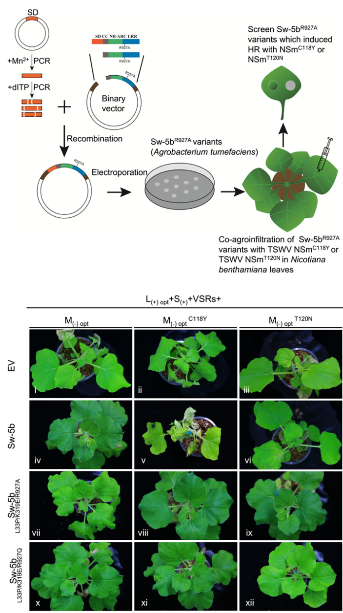 基于这些最新的研究进展,课题组改变早期在Sw-5b全长蛋白上盲目的进行随机突变的方法,采取逐步精准突变的策略:首先在LRR结构域第927位氨基酸位点引入一个自激活突变体,确保C端LRR结构域能够不受病毒变异的影响正常激活。根据两步识别机制的原理,在Sw-5bR927A的背景下,只要Sw-5bN末端SD结构域能够重新识别病毒变异株系,整个抗病蛋白Sw-5b就能够获得对TSWV变异株系的抗病性。因此,研究人员进一步专门针对SD结构域进行随机突变筛选,最终从2000多个突变体中成功筛选获得了能够同时识别TSWV野生型以及变异株系的两个Sw-5b新材料:Sw-5bL33P/K319E/R927A和Sw-5bL33P/K319E/R927Q。除此之外,Sw-5bL33P/K319E/R927A和Sw-5bL33P/K319E/R927Q对其它美洲型正番茄斑萎病毒属病毒也具有良好的抗病性。