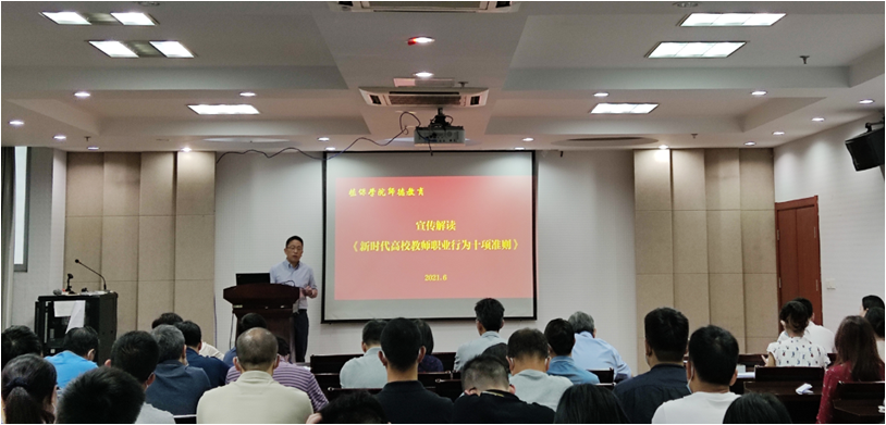 张正光详细解读了《新时代高校教师职业行为十项准则》,他强调师德师风建设的重要意义,要坚持把师德师风作为评价教师队伍素质的第一标准,提醒与会教职工遵守准则,提高政治站位,守好政治规矩和纪律,严守科研学术道德规范,教书育人培育好学生。