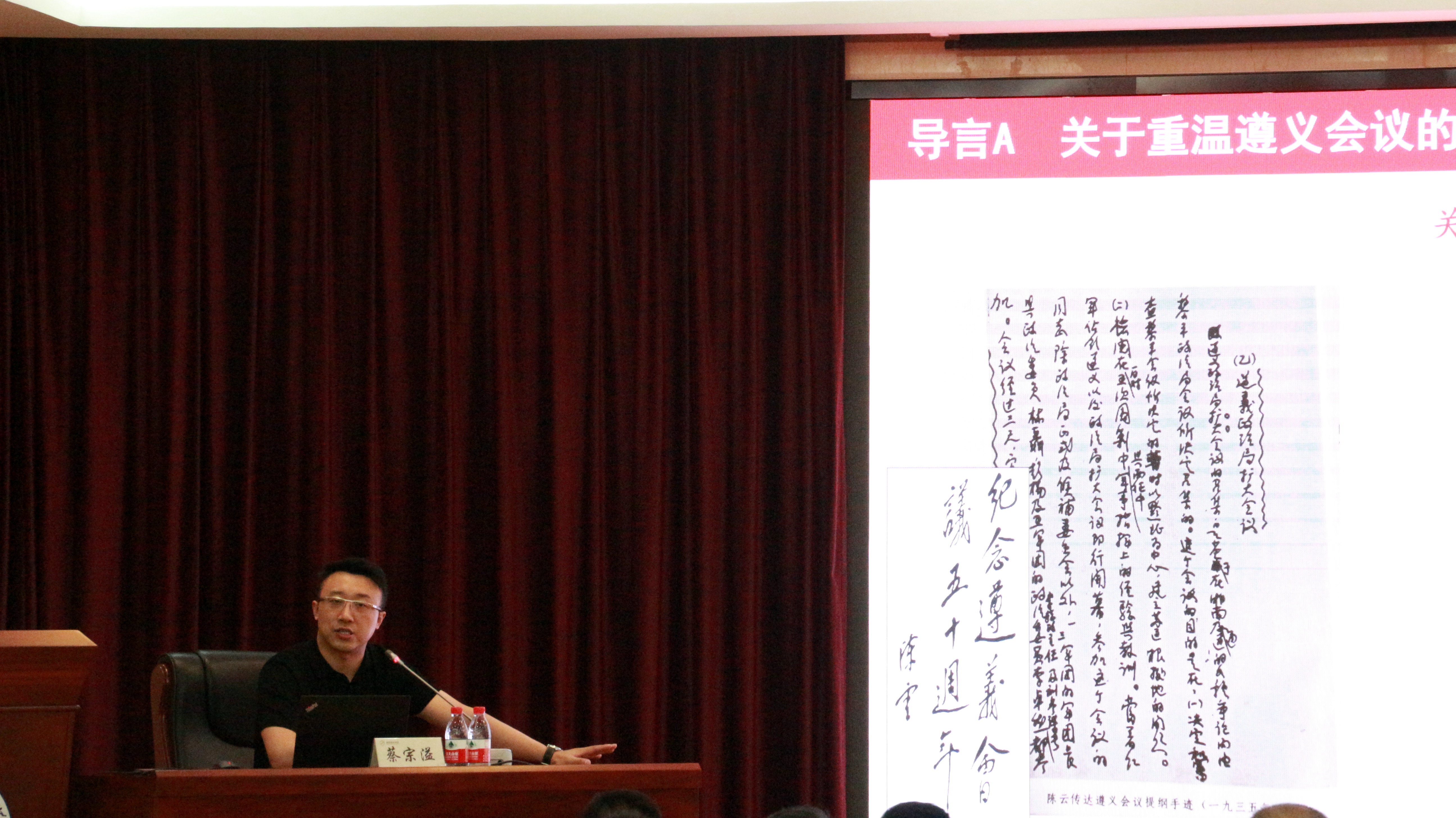 蔡宗溢从“遵义会议前后需要解决的重大问题、周恩来在遵义会议前后发挥的重要作用、遵义会议前后周恩来精神及当代价值”三个方面切入,并深刻剖析了周总理坚持真理、实事求是的思想境界;顾全大局,对党忠诚的政治格局;自我革命,严于律己的意志品格,启示广大师生党员不忘入党初心,永葆共产党人的政治本色,号召广大党员干部坚定“两个维护”,夯实政治立场,坚定“四个意识”,提高政治眼光,提升政治“三力”,强化政治本领,从党史中汲取智慧力量,坚定理想信念,践行初心使命,在新征程上砥砺前行。
