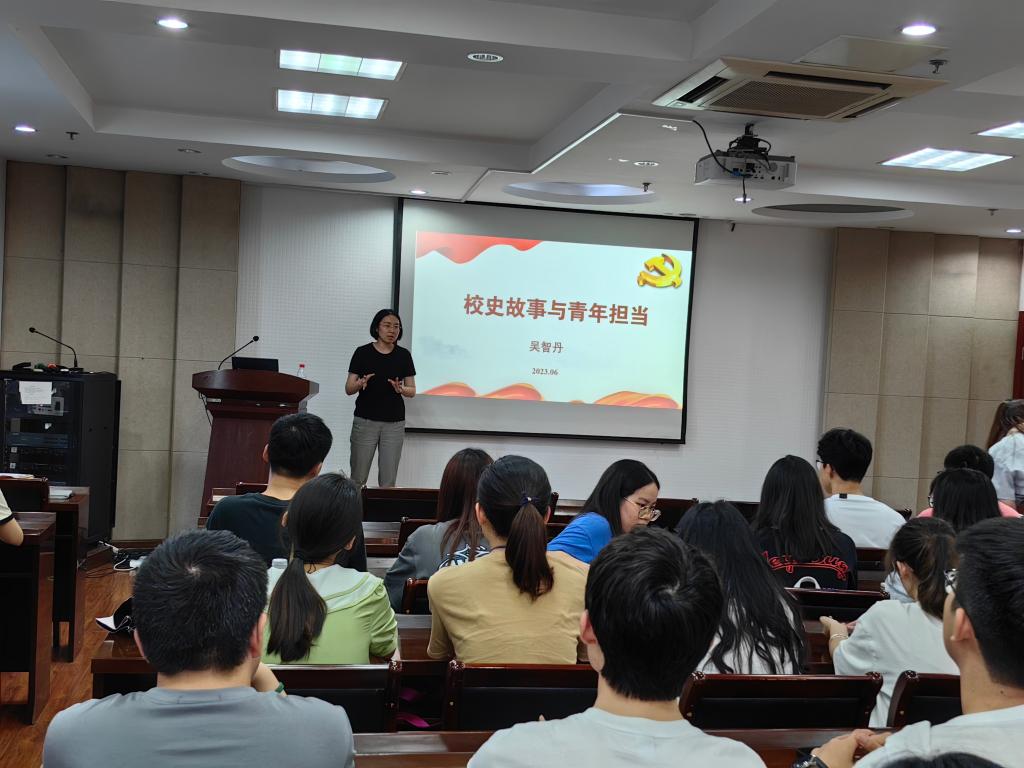 党委副书记吴智丹为联系党支部讲授《校史故事与青年担当》专题党课,她以学校和学院发展历史上大先生们的奋斗故事,激励青年学子以“诚朴勤仁”的校训精神为指引,立足中国大地、拓展世界眼光,爱国爱校、知农爱农,为实现中华民族伟大复兴贡献力量。