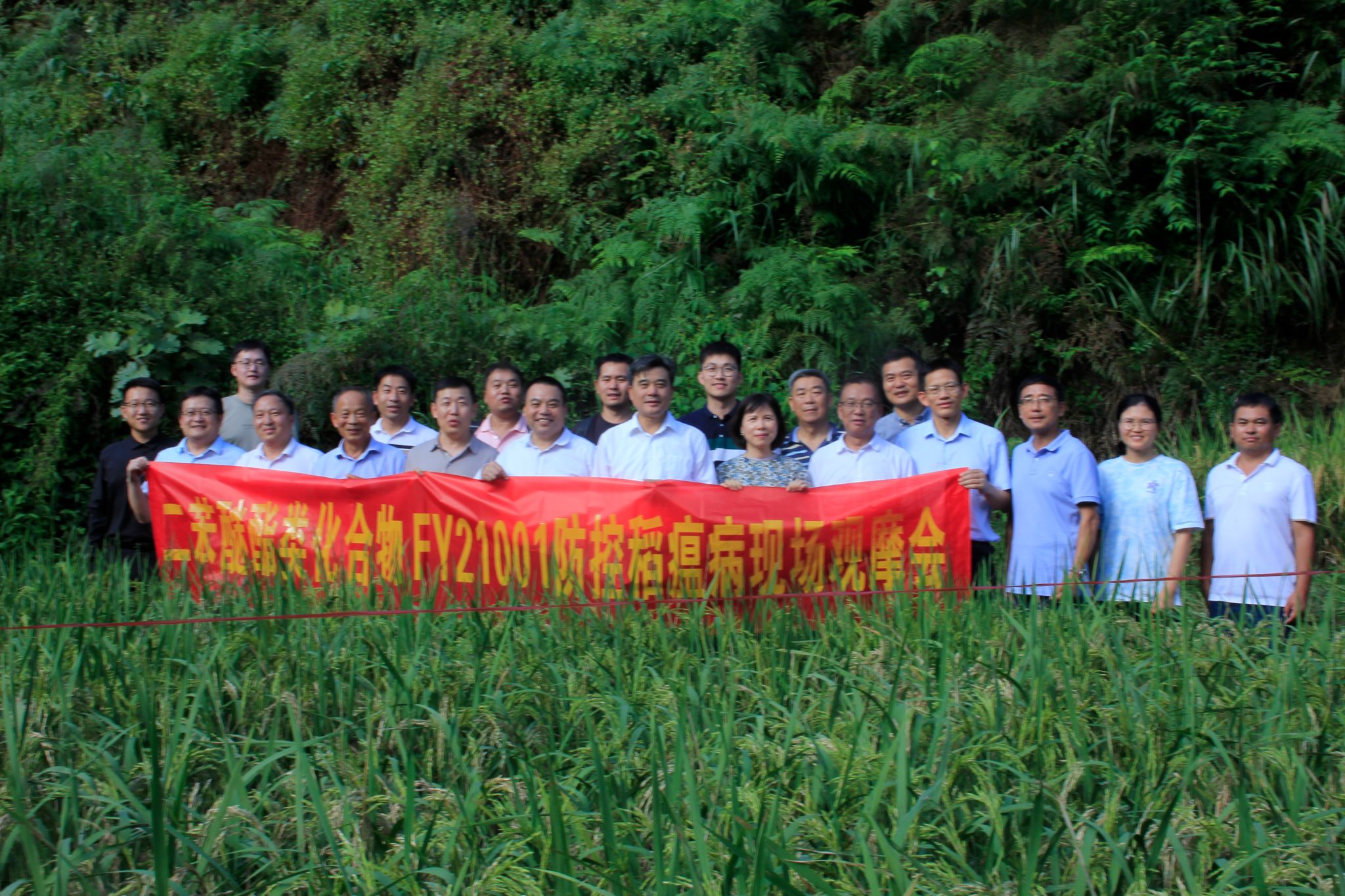 与会人员首先观摩了位于桃江县高桥镇罗溪村的稻瘟病防控药效试验基地,项目负责人张正光教授介绍了稻瘟病发病情况、施药过程和防治效果。专家组现场查看各个药剂处理的农香18水稻品种上的稻瘟病病情指数和田间防效,一致认为10% FY21001悬浮剂(有效成分15g/亩)、10% FY21001纳米乳剂(有效成分15g/亩)与对照药剂75%三环唑可湿性粉剂(有效成分22.5g/亩)防治效果相当,统计分析没有显著性差异。