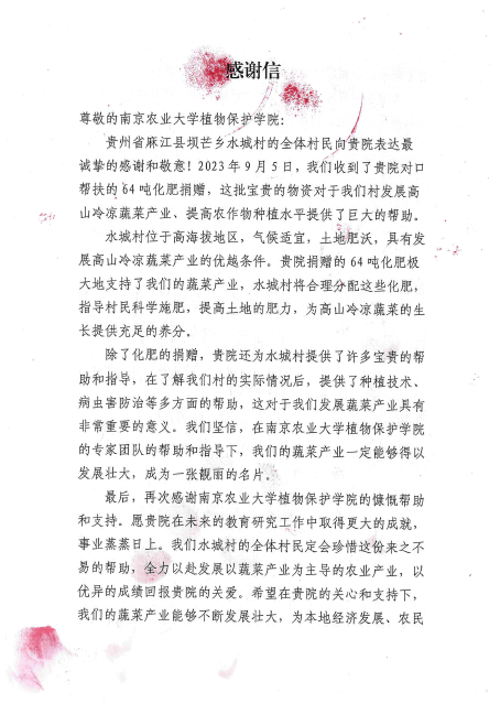 学院先后选派陈长军教授、薛晓峰教授等技术专家赴水城村现场调研蔬菜、蓝莓等产业发展中的科学问题;举办了蓝莓病虫害防治、蔬菜病虫害防治、有机蔬菜产业体系介绍等培训课程;邀请了麻江县植保技术人员参加第43期全国农作物病虫测报技术培训班;邀请了江苏笨农生态农业有限公司、杭州欢田喜地农业科技有限公司等优秀企业奔赴水城村,宣传推广水城村的农产品和劳动供给,共商村企合作之路。先后培训基层技术人员300余人次;使用党费慰问困难户4万元;消费扶贫累计6万余元;通过电商平台销售水城村蜂蜜500斤;赠送太阳能防虫灯、生物源农药等物资20余万元;赠送住商肥料64吨,为促进该村党支部建设和产业发展做出了积极贡献。
