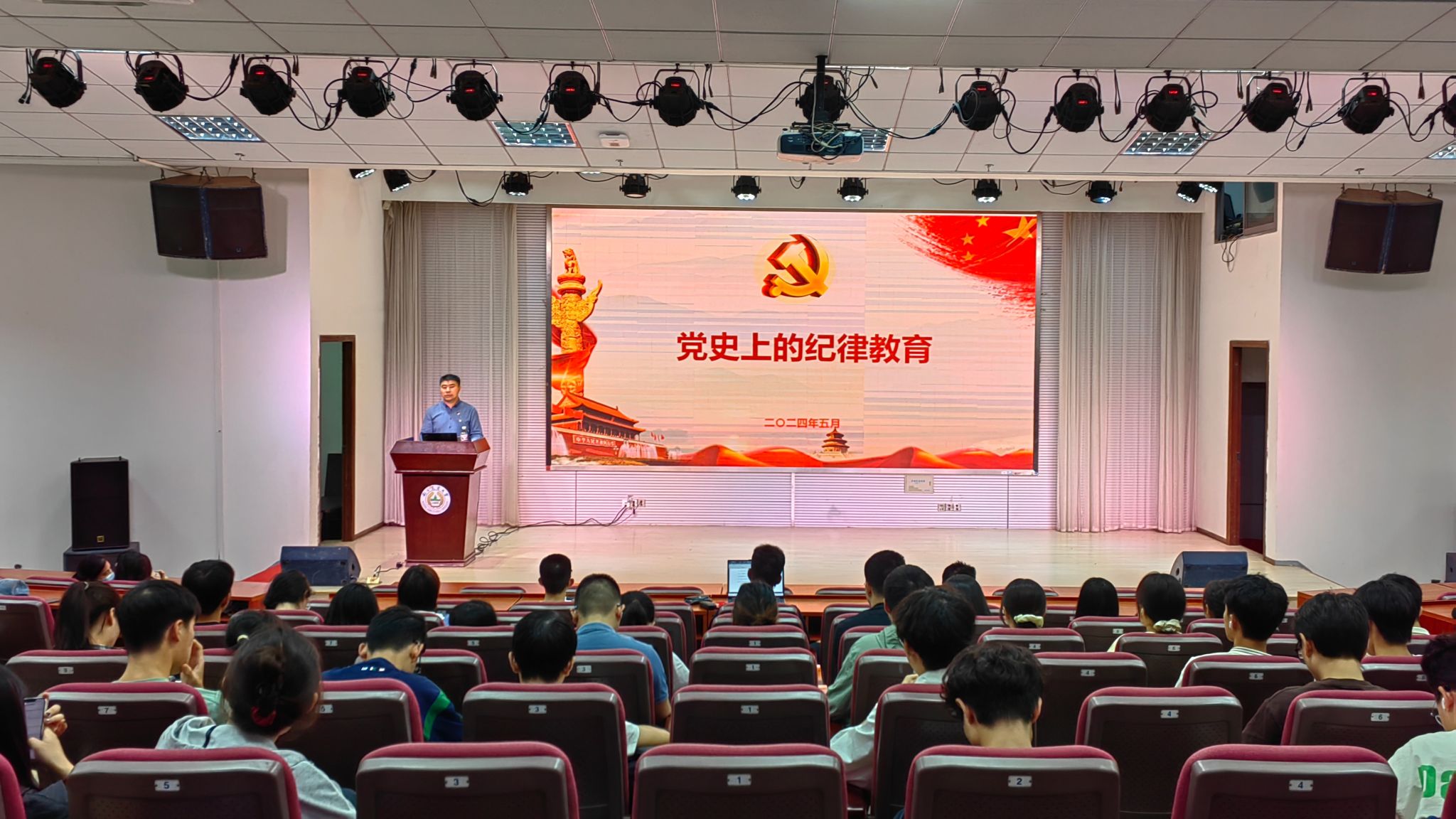 在教四楼报告厅举办党纪学习教育专题党课,学院党委副书记(主持工作)许承保为学预备党员和积极分子带来一堂“党史上的纪律教育”专题党课。