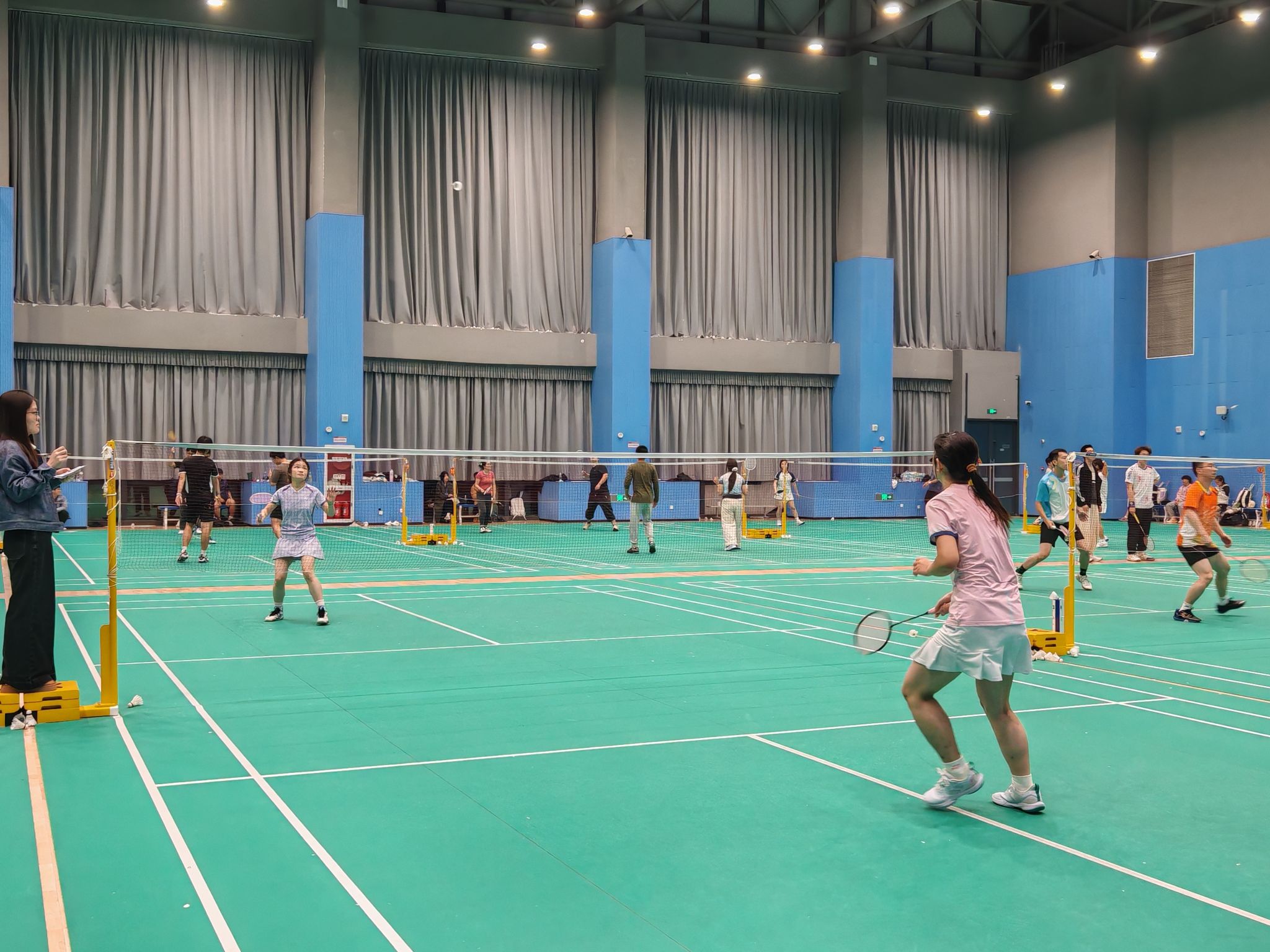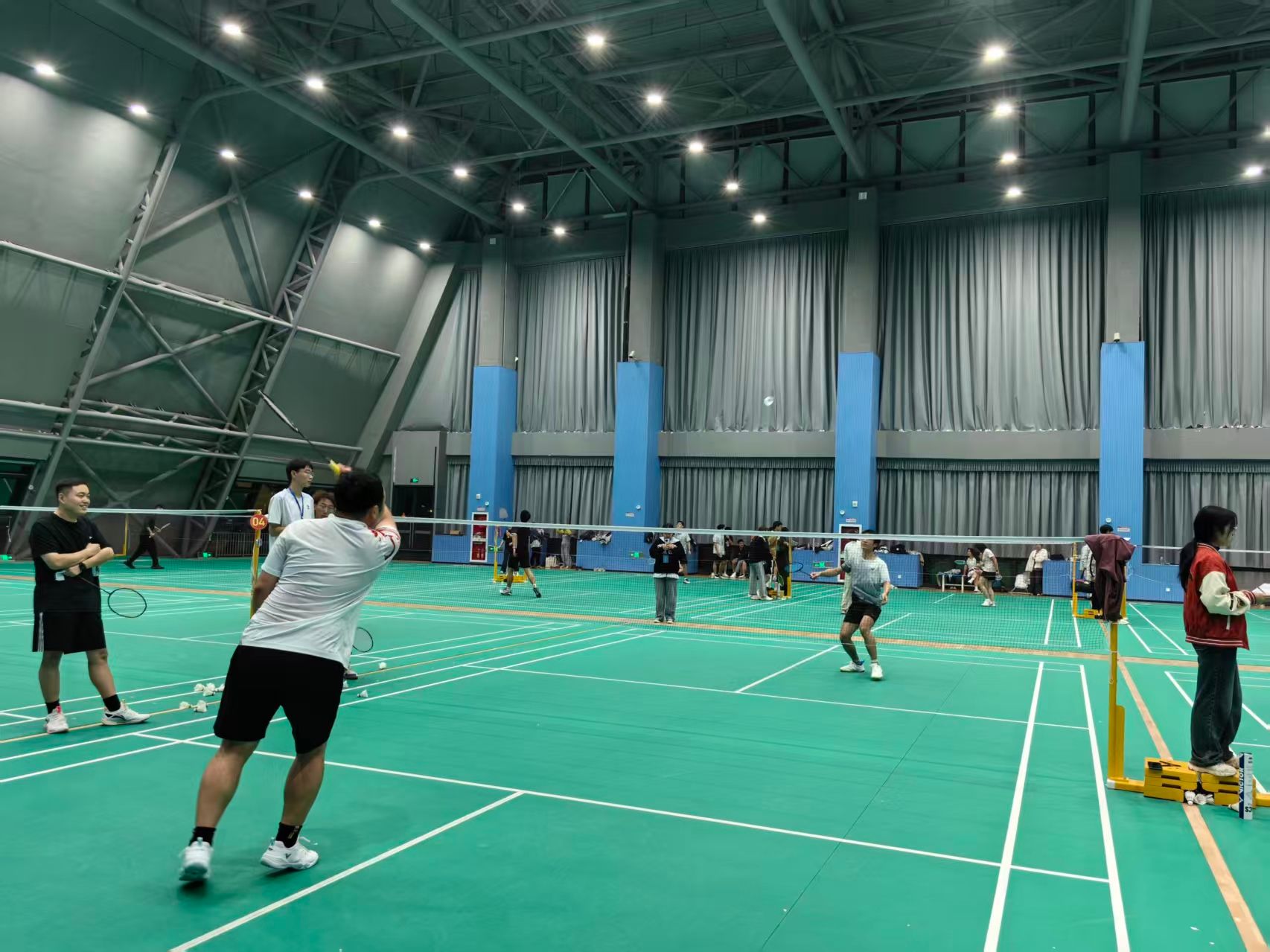 比赛正式开始后,场馆内瞬间沸腾。男单赛场上,选手们脚步迅捷,时而跃起扣杀、时而网前轻吊,每一次精准回球都引来阵阵欢呼;女单选手们则展现出细腻的控球技巧,攻防转换间尽显韧性;男双、女双搭档配合默契,眼神交汇间便完成战术衔接;混双选手更是攻防互补,用协作诠释运动之美。赛场上,大家秉持“友谊第一,比赛第二”的原则,既有全力以赴的竞技态度,也有失误后的互相鼓励,每一个瞬间都彰显着植保研究生的朝气与担当。