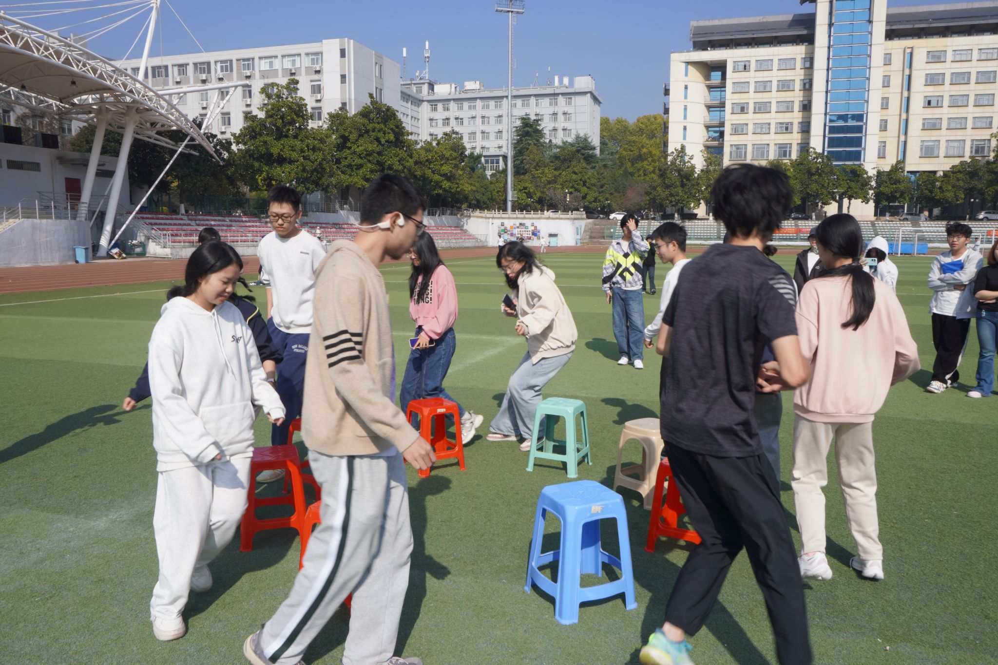 在抢凳子中,音乐停止的刹那,经过多圈追逐后参赛者们仍能迅速反应争抢座位。
