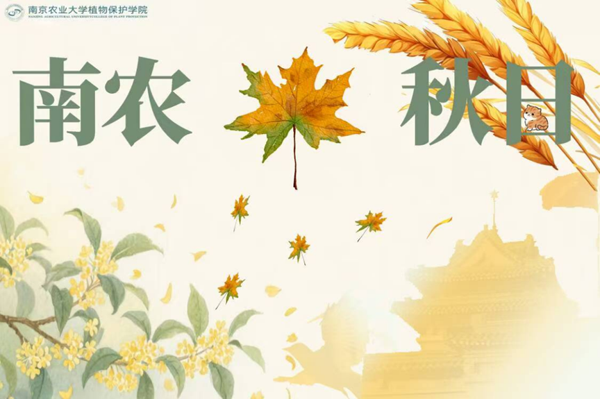 的院徽,把南农秋日的题目放在明显的正中央,再在周边点缀一些秋日的落叶,桂花,小麦等,再修整一下整体协调性,使它们融为一体。