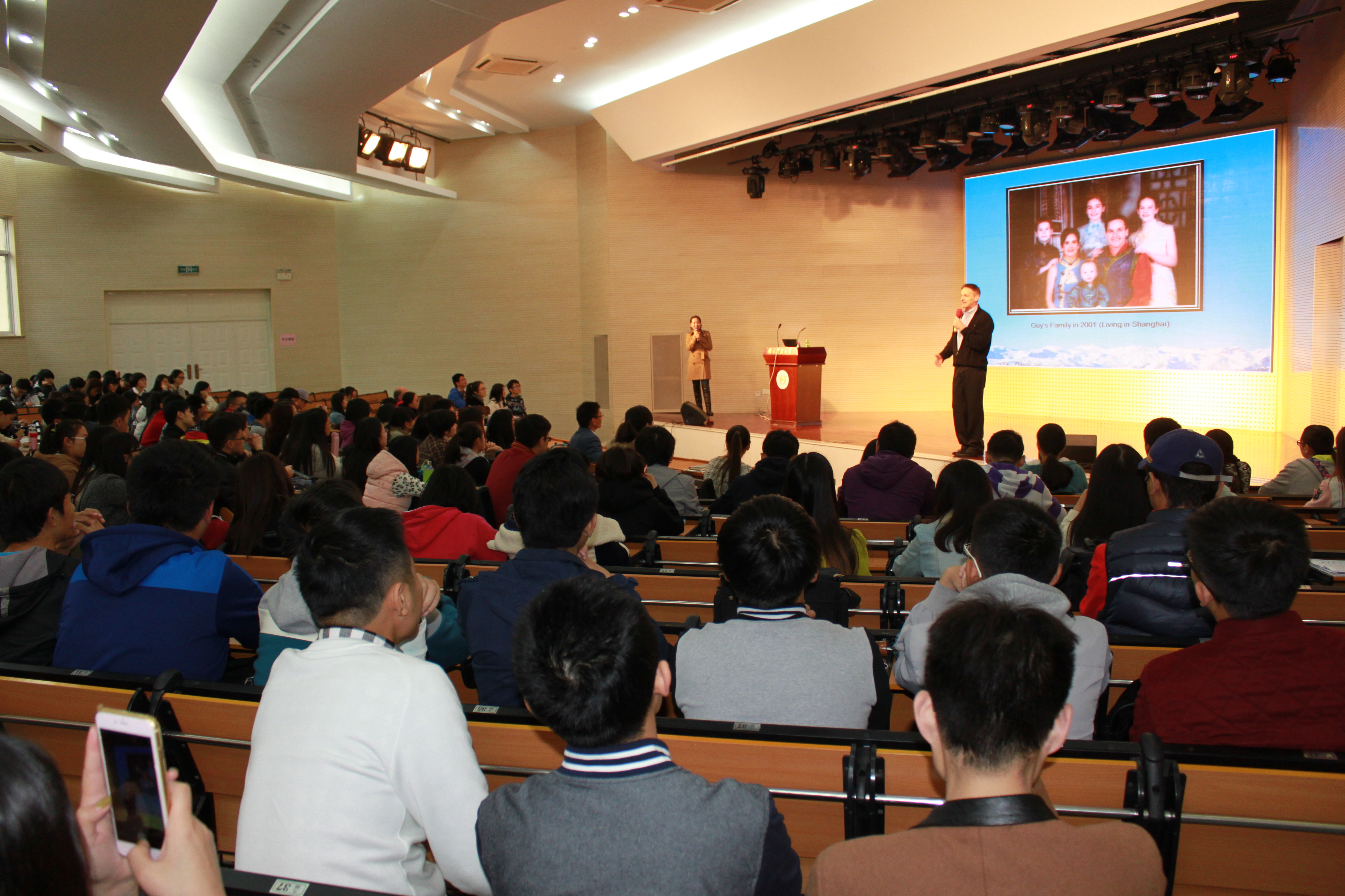 Mr Guy Armstrong进行精短而风趣的自我介绍后,进入讲座正题。他提出一条golden Rule: Treat other the way you want to be treated.即以自己希望被对待的方式来对待他人,这也正是与人相处的精髓所在。Mr Guy Armstrong以亲身经历以及四幅对比鲜明的图片为同学们讲述中西文化的显著差异,并借此诠释着golden Rule,幽默之中寓理于事。