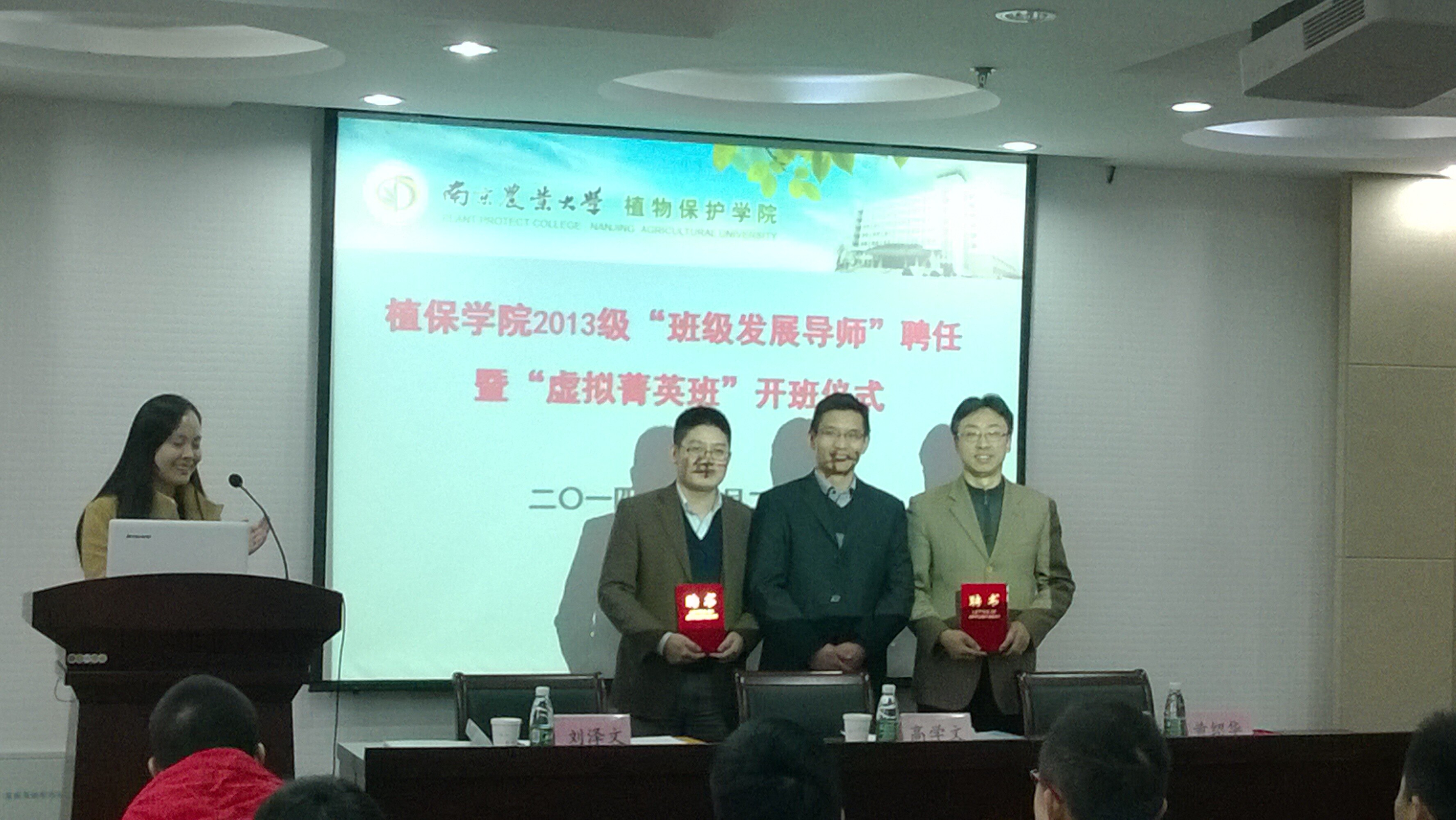 李艳丹简要介绍活动流程及内容后,黄绍华为“班级发展导师”颁发聘书。学院聘请党委书记吴益东教授担任植保131班导师,副院长高学文教授担任植保132班导师,副院长刘泽文教授担任植保133班导师,院长王源超教授担任植保134班导师。刘泽文代表班级发展导师致辞,他表示即使老师们工作再忙碌,也非常愿意与学生交流,感受年轻的心态与积极的思想,并在学术及人生道路选择方面给予学生指导。