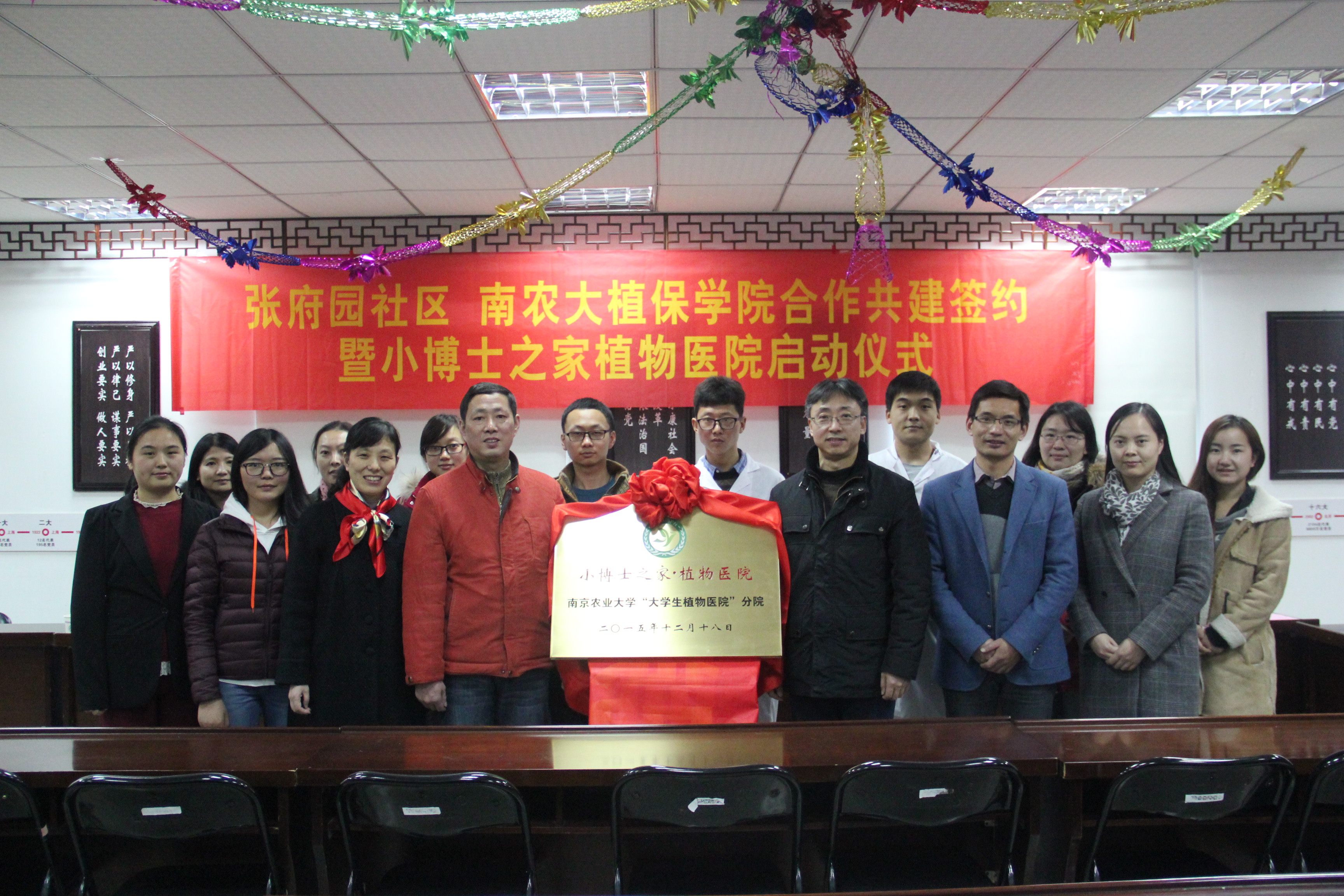 1218日下午,嫩草影院 赴南京朝天宫街道,与张府园社区共建大学生植物医院社区分院。植保院党委副书记黄绍华、副院长高学文、张府园社区书记吴波等参加。