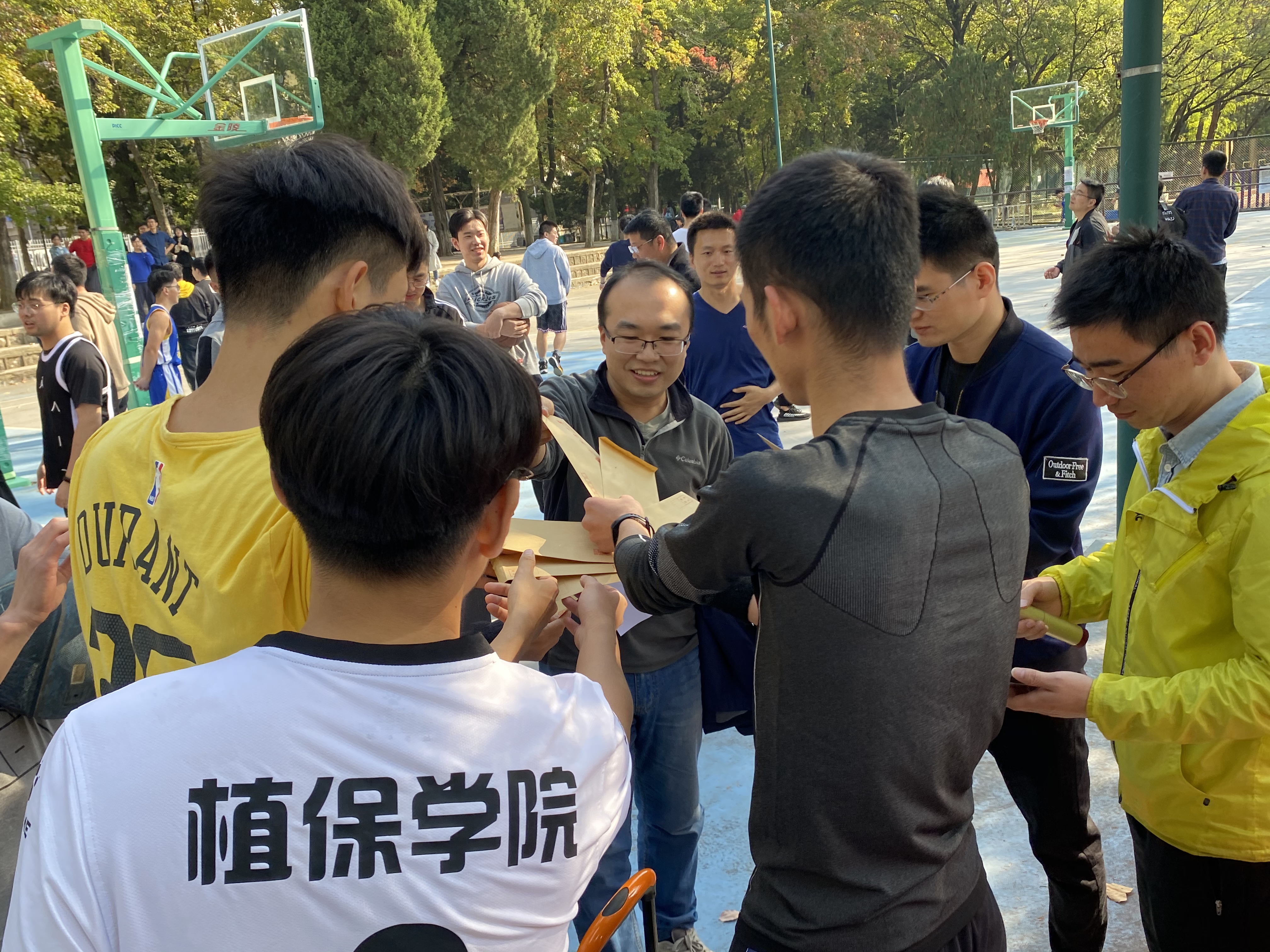 赛前,研究生辅导员罗舜文简单说明了此次比赛的目的,隆重介绍了参加比赛的球队:叶永浩老师带领的专业团队,王兴亮老师带领的梦之队,陶小荣老师带领的MPV-全明星队,董莎萌老师带领的梦想520队,张海峰老师带领的梦之篮队,伍辉军老师带领的植梦飞扬队,吴顺凡老师带领的植保篮王队,张峰老师带领的纯属娱乐队,陈长军老师带领的打铁队。各个队伍精神饱满,斗志昂扬。
