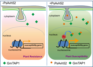 组蛋白乙酰化修饰是生物生长发育过程中参与调控基因表达的一种重要方式。本研究组此前发现大豆疫霉病菌侵染寄主中后期表达的效应子Avh23能够抑制组蛋白乙酰化酶复合体的形成,干扰组蛋白的乙酰化,抑制了抗病基因的表达 (Current Biology,2017)。本项研究中发现大豆疫霉侵染早期分泌的效应分子Avh52能够“挟持”大豆的组蛋白乙酰转移酶蛋白GmTAP1,使GmTAP1由细胞质进入细胞核,通过乙酰化植物感病基因启动子区组蛋白H2A及H3上的激活位点,激活寄主感病基因的表达,促进了病原菌的成功侵染。以上研究表明病原菌能够在侵染寄主不同阶段能够利用不同效应子,通过精确调控表观遗传修饰水平,干扰植物免疫反应。