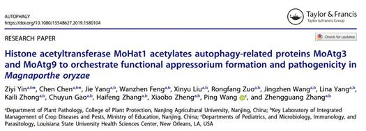 近日,细胞生物学领域的权威期刊“Autophagy”(5年影响因子11.8)在线发表了我校关于组蛋白乙酰转移酶介导细胞自噬控制稻瘟病菌的功能性附着胞形成和致病力的研究论文“Histone acetyltransferase MoHat1 acetylates autophagy-related proteins MoAtg3 and MoAtg9 to orchestrate functional appressorium formation and pathogenicity in Magnaporthe oryzae”。该论文第一署名单位为嫩草影院