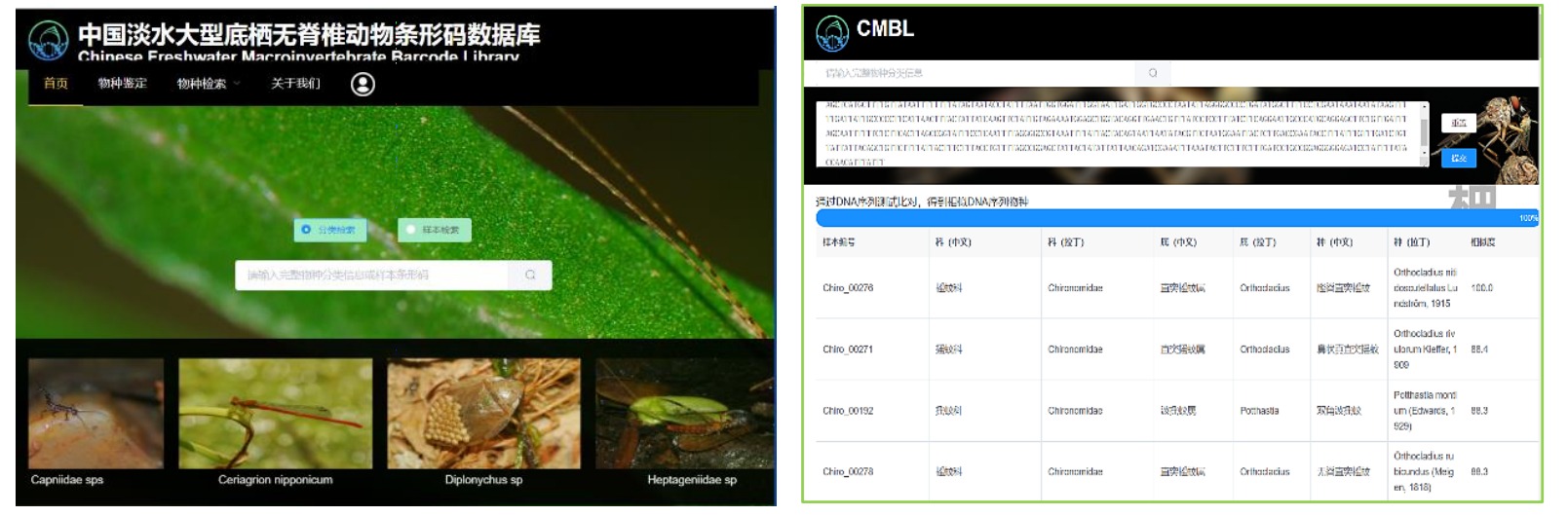 此外,本数据库可为我国淡水生物多样性调查与评估、外来入侵水生生物的早期监测、预警与风险评估、水质敏感物种(如EPT水生昆虫,E:蜉蝣目、P:襀翅目、T:毛翅目)的监测与识别,以及更加科学合理地底栖动物物种水平的耐污值和BI生物指数、BMWP指数评价体系等提供数据积累和支撑。