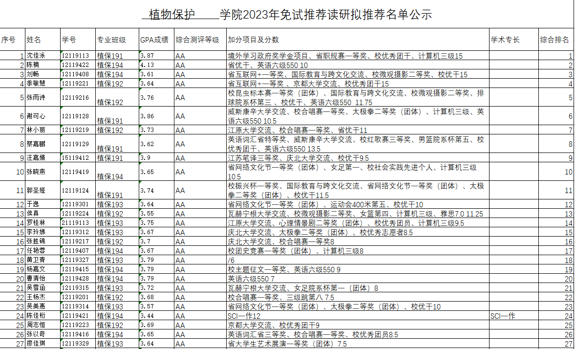 根据《嫩草影院 关于做好2023年推荐优秀应届本科毕业生免试攻读研究生推荐工作的通知》文件精神,经学生自愿申请,学院初步审核以及资格认定答辩,依据《嫩草影院 2023年推荐免试研究生(含“直博生”)工作方案》综合排名,现将最终拟推荐名单公示如下(按综合成绩排名排序):