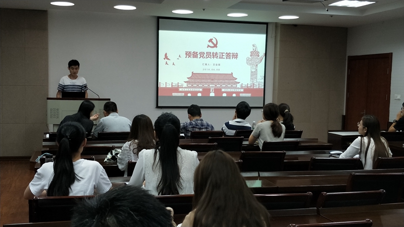 答辩分为两个环节,首先各位预备党员通过PPT汇报预备期一年内自己在思想,学习,工作等方面的情况,并针对预备时提出的缺点汇报改进情况。然后是现场问答,评委老师从党课学习,实践活动,未来发展等方面提出问题,并且给同学们提出了中肯的建议。