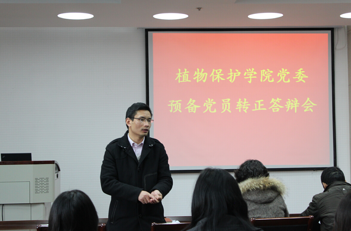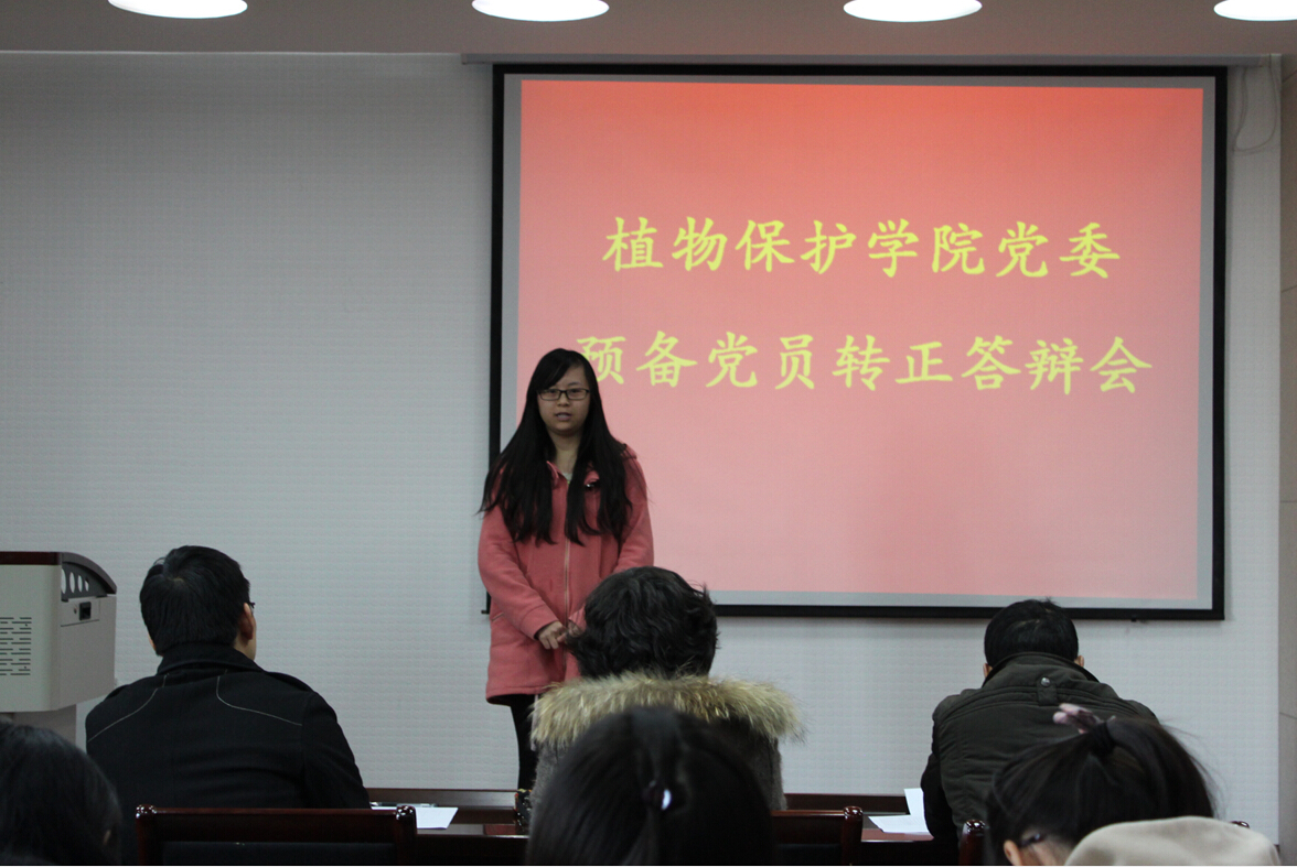 于理科楼C305举行预备党员转正答辩会,出席会议的评委为院党委副书记黄绍华、农药系教工支部书记高聪芬、昆虫系教工支部书记李元喜、研究生辅导员吴智丹、本科生辅导员李艳丹,张昊、何凡、秦晓宇等十名预备党员参加答辩,会议由吴智丹主持。