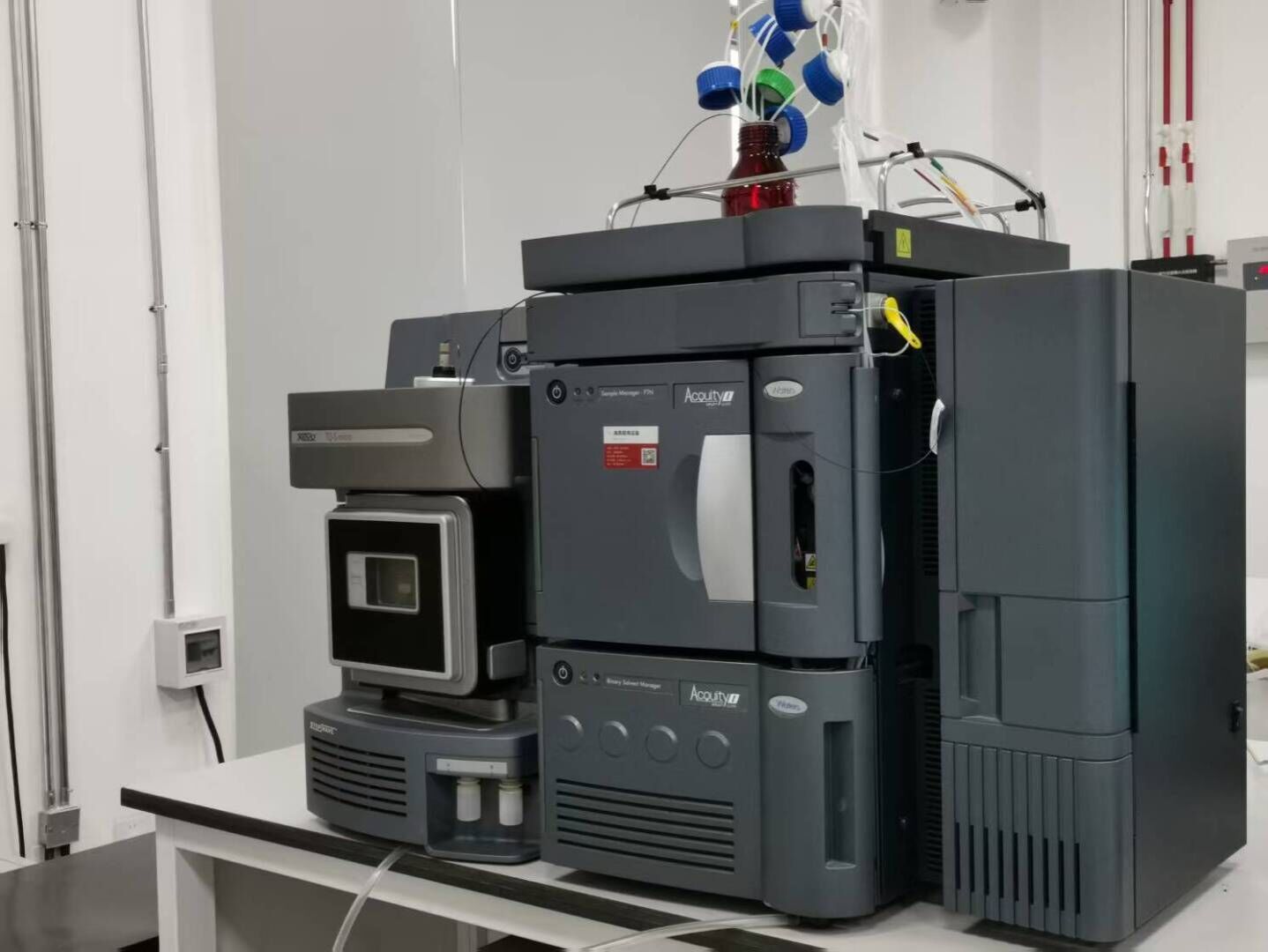 1、液相色谱部分:二元高压混合泵、温控自动进样器、可冷却的柱温箱及Masslynx数据分析工作站;